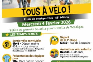 Programme mercredi 4 février 2026 : 9h45 : sortie conviviale de 45 km organisée par le Vélo Club de Bellegarde, ouverte à tous les niveaux. (Rendez-vous à 9h45 devant la mairie de Bellegarde). Contact / Informations : Denis Fluteaux – 06 82 03 61 61 12h : Etoile de Bessèges : présentation des équipes (place Bastido Bonnet), départ à 12h30 […]